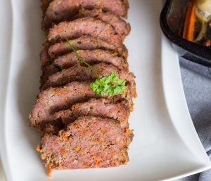 - When satisfied, add 2 deciliters of liquid (1 dl of water and 1 dl of wine or just water) to the baking pan and add remained carrots and onions, then cover with aluminum foil and bake for 45 minutes at 200 degrees Celsius. After that, remove the aluminum foil and bake for another 30 minutes, until the meat is browned nicely. Allow the meat loaf to rest a little, then cut it warm and serve.